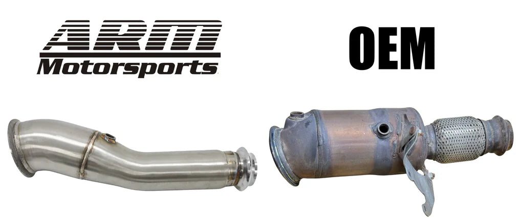 The ARM Motorsports N26 Downpipe is the best hardware upgrade to get the most power from your 228i, 320i, or 328i. The N26 has a stock downpipe with a large catalyst that drastically restricts exhaust flow. This limits not only the amount of power N26 can make on the stock tune, but also prevents upgrading to a stage 2 tune due to excessive back-pressure. An N26 downpipe upgrade is the first hardware upgrade every N26 owner should invest in. Upgrading your downpipe unlocks the most power, increases turbo spool, allows you to run stage 2+ tuning, and improves the exhaust note of your N26 powered BMW.
