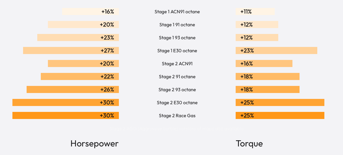 - (Optional) Custom tuning available through tuners in the bootmod3 Tuner Directory. bootmod3 contains a full map editor so you can tune your car yourself or with your local tuner of choice as well.